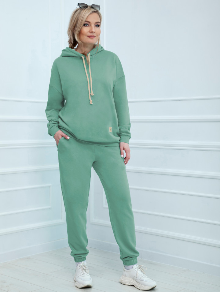Костюм брючный женский, состоящий из джемпера и брюк из трикотажного полотна с хлопком. Джемпер свободного покроя, удлиненный до линии бедер на манжете по низу изделия, без застежки, с капюшоном, с рукавом на спущенной пройме и манжетами по низу рукавов. Брюки прямые на манжетах по низу брюк, на поясе с эластичной тесьмой и шнурком, с боковыми карманами на молниях по передним половинкам брюк.