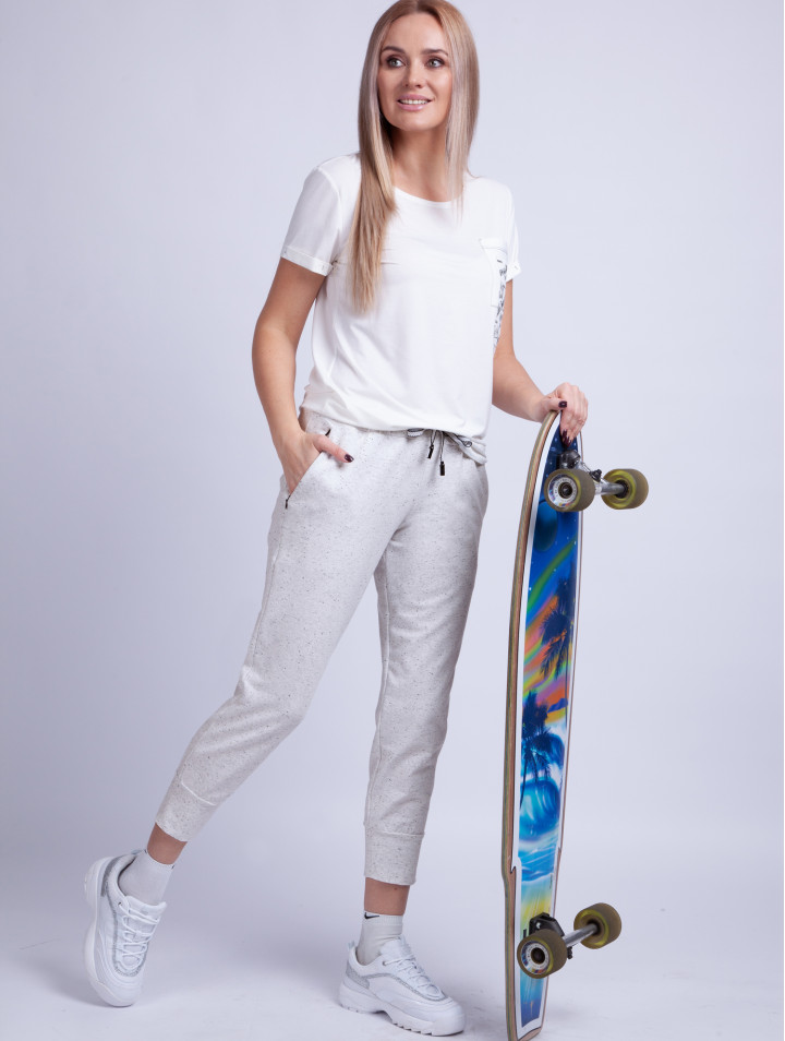 Комплект женский спортивный, состоящий из джемпера и брюк из трикотажного полотна. Джемпер с коротким рукавом с манжетой по низу рукава вырез горловины полукруглый, по переду-накладной карман с крупной нашивкой с дизайном. Брюки прямые на поясе с эластичной тесьмой, 7/8 длины на манжетах по низу, по передним половинкам брюк карманы с молниями, один накладной карман сзади.