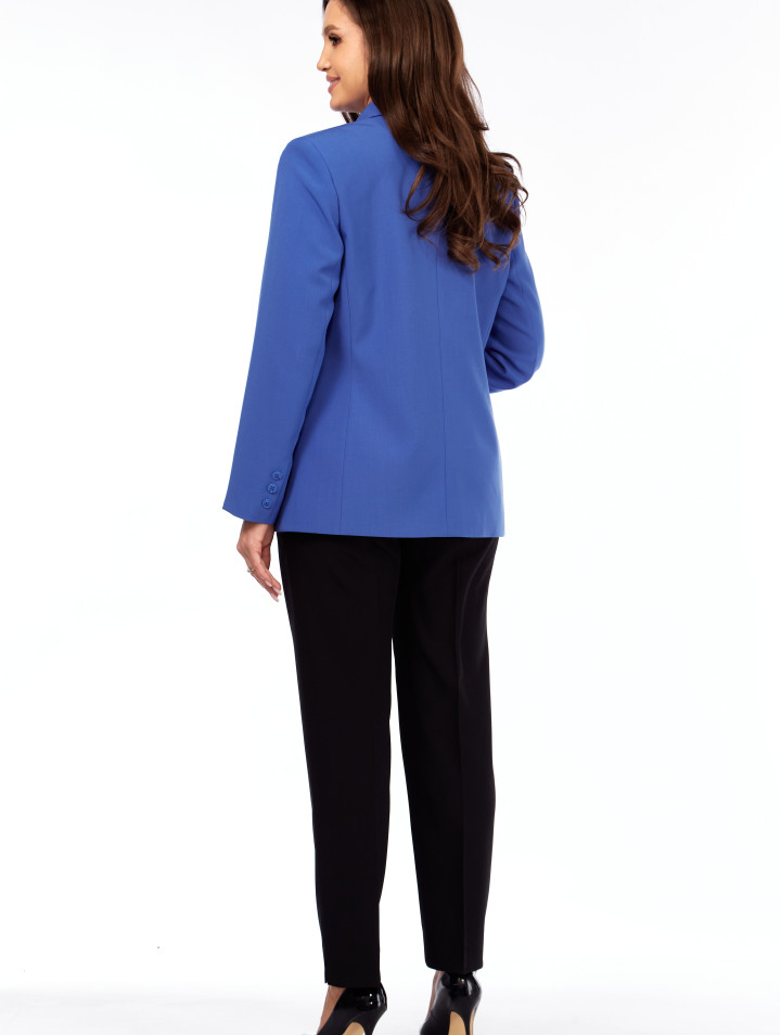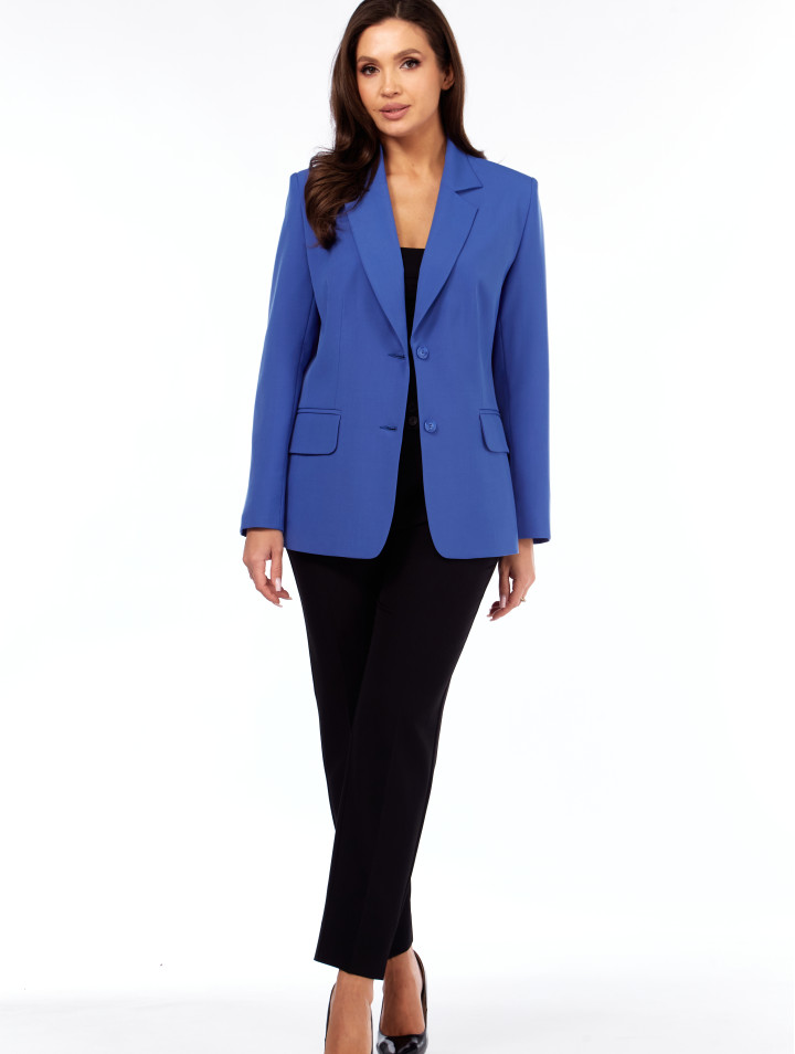 Жакет женский полуприлегающего силуэта, с втачным рукавом, воротник отложной с лацканами, по переду - карманы с клапанами, по низу рукава шлица с пуговицами, застёжка спереди на петли и пуговицы. Изделие на подкладке.