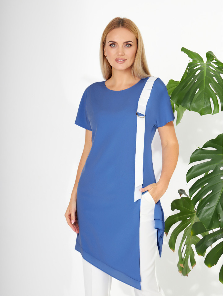 женский, состоящий из туники и брюк. Туника прямого силуэта со спущенной проймой. По переду от плеча расположена декоративная