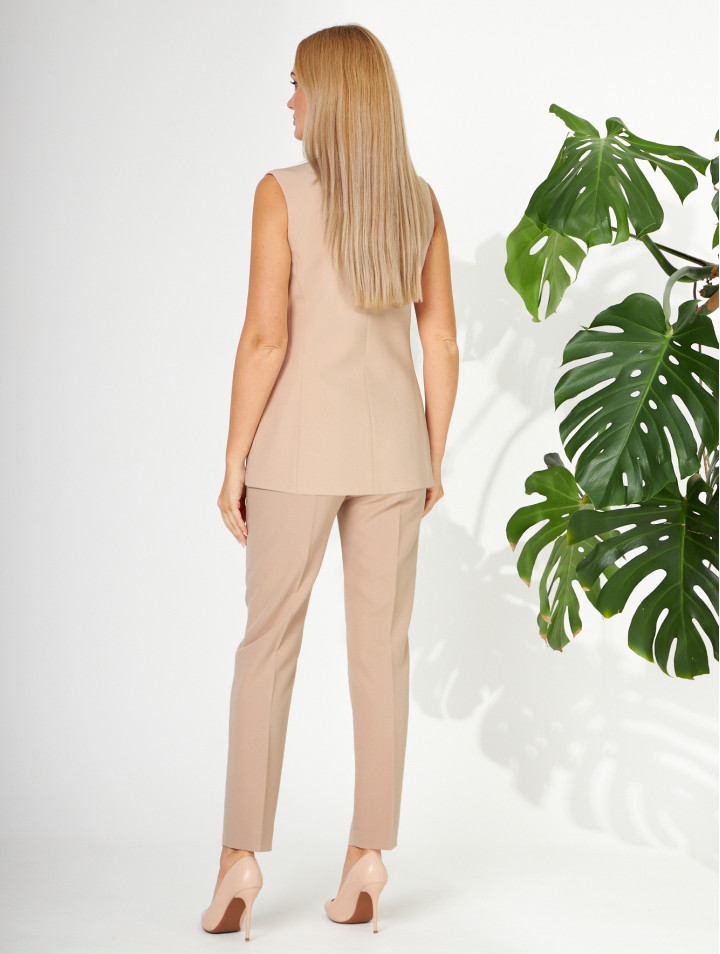 Костюм женский брючный, состоящий из жилета и брюк из одного вида ткани. Жилет полуприлегающий ,2-бортный с отложными лацканами. Изделие на подкладке. Брюки прямые, зауженные к низу со стрелками.