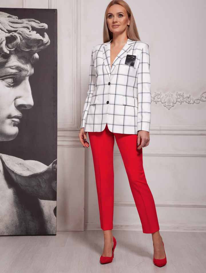 Комплект женский, состоящий из жакета и брюк из разных видов ткани. Жакет полуприлегающего силуэта из поливискозной ткани в клетку, с втачным по переду – карманы с клапаном и накладной нагрудный карман с нашивкой из кожи с теснением. Изделие на подкладке. Брюки из однотонной ткани, классические прямые со стрелкой, на поясе–кокетке с застежкой спереди на молнию и пуговицы, с боковыми карманами.