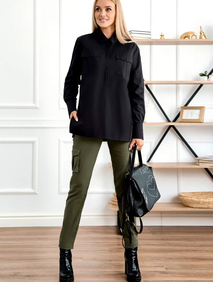 и брюк из разных видов ткани . Блуза свободного покроя ,удлиненная ,с