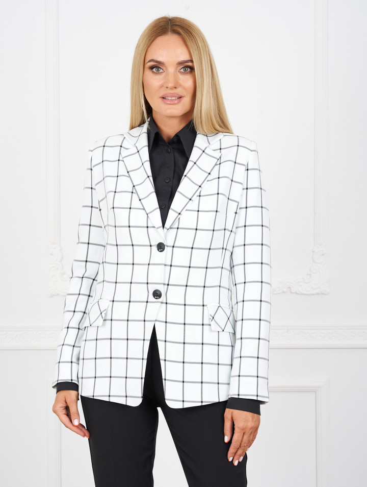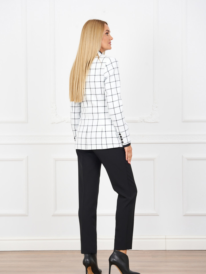 Комплект женский состоит из жакета, брюк и блузки. Жакет прилегающего силуэта с вертикальными рельефами, с отложным воротником, рукав со шлицей, застежка на петли и пуговицы, спереди карманы с клапаном, изделие на подкладке. Брюки прямые, узкие, со стрелками, на поясе-кокетке, со шлевками, застежка спереди на молнию и пуговицы, с боковыми карманами. Блузка полуприлегающего силуэта с нагрудными вытачками, воротник на стойке, рукав с манжетой по низу, застежка на планку с пуговицами, спереди накладной карман.