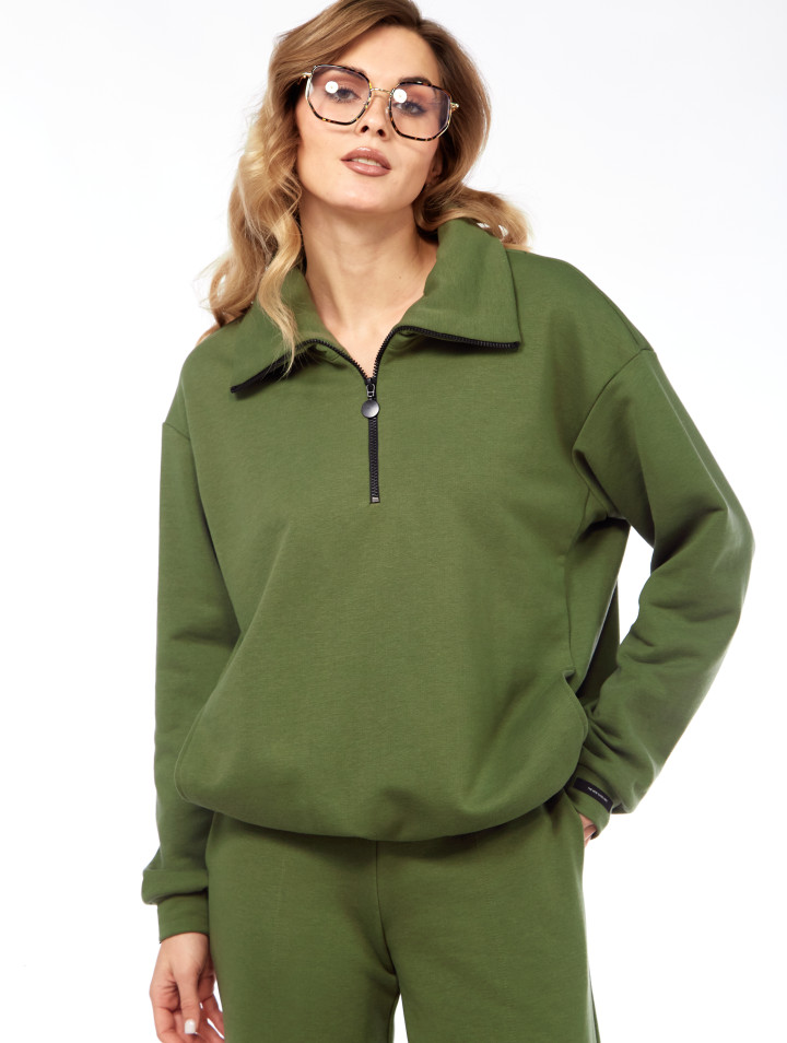 Комплект женский брючный спортивный, состоящий из джемпера и брюк. Джемпер свободного покроя со спущенной проймой и рукавом на манжете, с застёжкой спереди на молнию, с воротником, с карманами по переду изделия. На манжете по низу изделия. Брюки прямые, расширенные к низу, на поясе с эластичной тесьмой, с карманами в боковых швах.