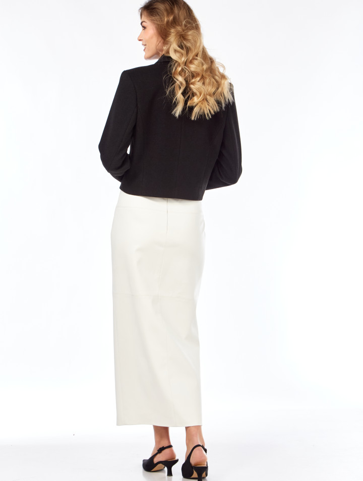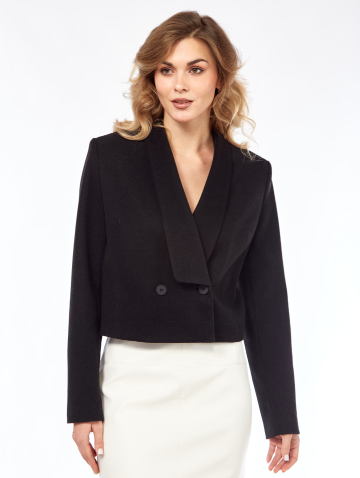 Комплект состоящий, из жакета и юбки. Жакет укороченный прямого силуэта с втачным рукавом и воротником отложным до линии талии, застёжка двубортная на петли и пуговицы. Изделие на подкладке. Юбка их кожзаменителя узкая, прямая, длинная. По переднему полотнищу шлица и подрезы. Застёжка в среднем шве заднего полотнища на молнию.
