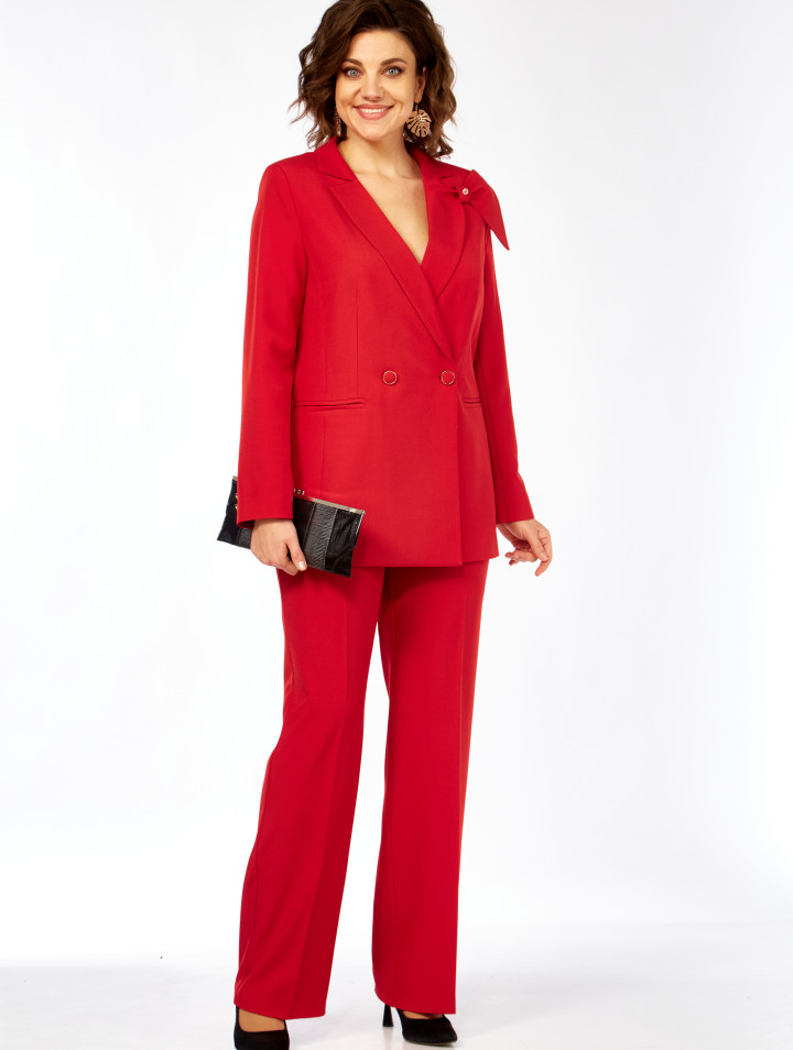Комплект женский брючный из костюмной ткани с эластаном. Жакет полуприлегающего силуэта, 2-бортный с отложным ассиметричным воротником, по переду-карманы, рукав втачной со шлицей и пуговицами. Изделие на подкладке. Брюки прямые свободные, с боковыми карманами, на поясе с эластичной тесьмой.