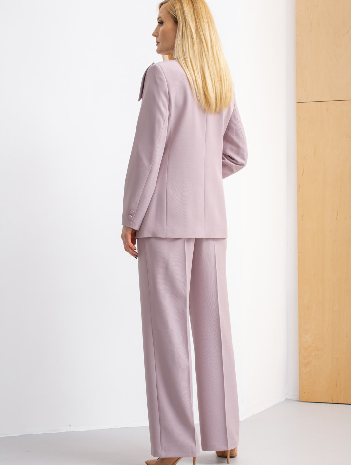 Комплект женский брючный из костюмной ткани с эластаном. Жакет полуприлегающего силуэта, 2-бортный с отложным ассиметричным воротником, по переду-карманы, рукав втачной со шлицей и пуговицами. Изделие на подкладке. Брюки прямые свободные, с боковыми карманами, на поясе с эластичной тесьмой.