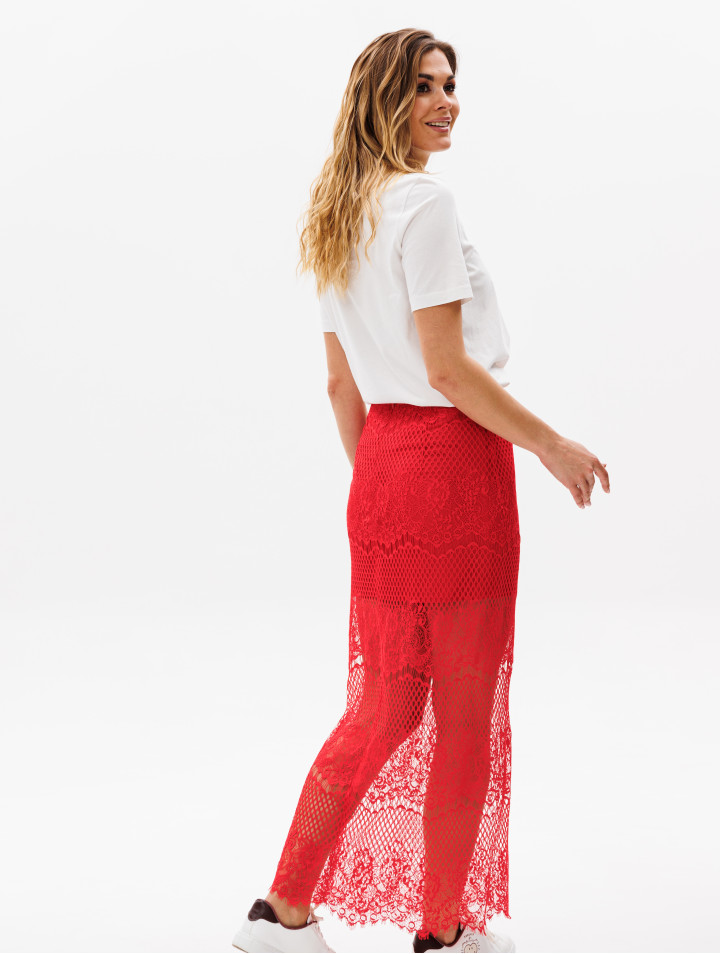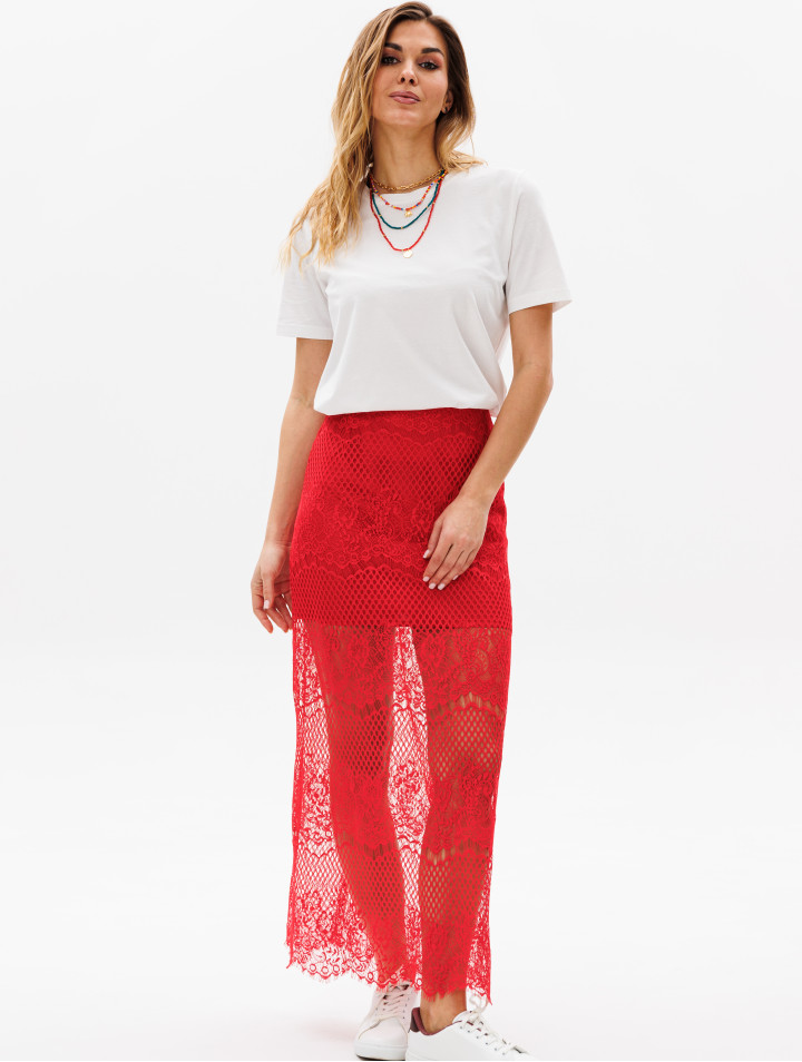 Юбка женская из кружевного полотна. Удлинённая до щиколотки, без боковых швов, с застёжкой по среднему шву заднего полотнища на молнию и кнопку. Изделие на подкладке.
