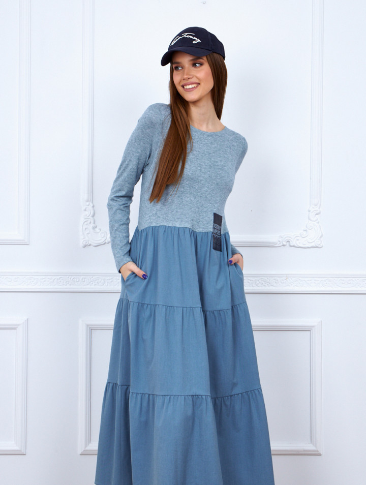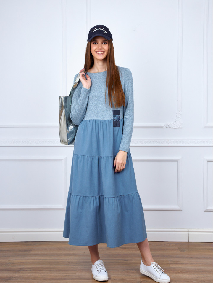 Платье женское , комбинированное из двух видов ткани . Свободного силуэта , расширенное книзу ,с подрезом выше линии талии и тремя воланами с небольшой сборкой ,рукав втачной, с боковых швах карманы