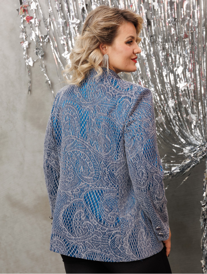 Жакет женский полуприлегающего силуэта, воротник-стойка, V-образный вырез горловины, с застёжкой спереди на пуговицы, борта закруглённые. Изделие на подкладке.