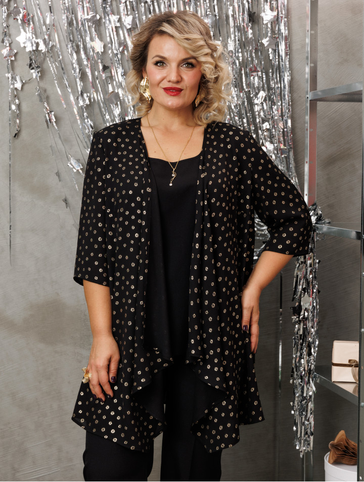 Комплект женский, состоящий из кардигана, блузки и брюк из разных видов ткани. Кардиган без застёжки, из шифона с дизайном, свободного силуэта, с втачным рукавом 3/4 длины, по переду складывается мягкими складками и углами. Блузка-топ без рукавов, с полукруглым вырезом горловины, свободная, до бёдер. Брюки прямые, широкие, с карманами, на поясе, частично с эластичной тесьмой.