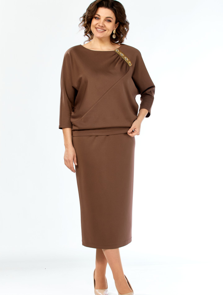 Комплект женский, состоящий из джемпера и юбки. Джемпер покроя "летучая мышь" с 3/4 рукавом, вырез горловины "лодочка", по переду ассиметричные подрезы и драпировка, от горловины-вставка из тесьмы пайеток и камней, как декоративный элемент. Юбка прямая на поясе с эластичной тесьмой.