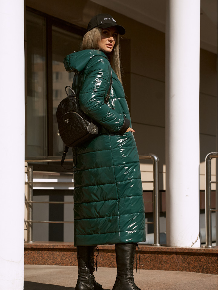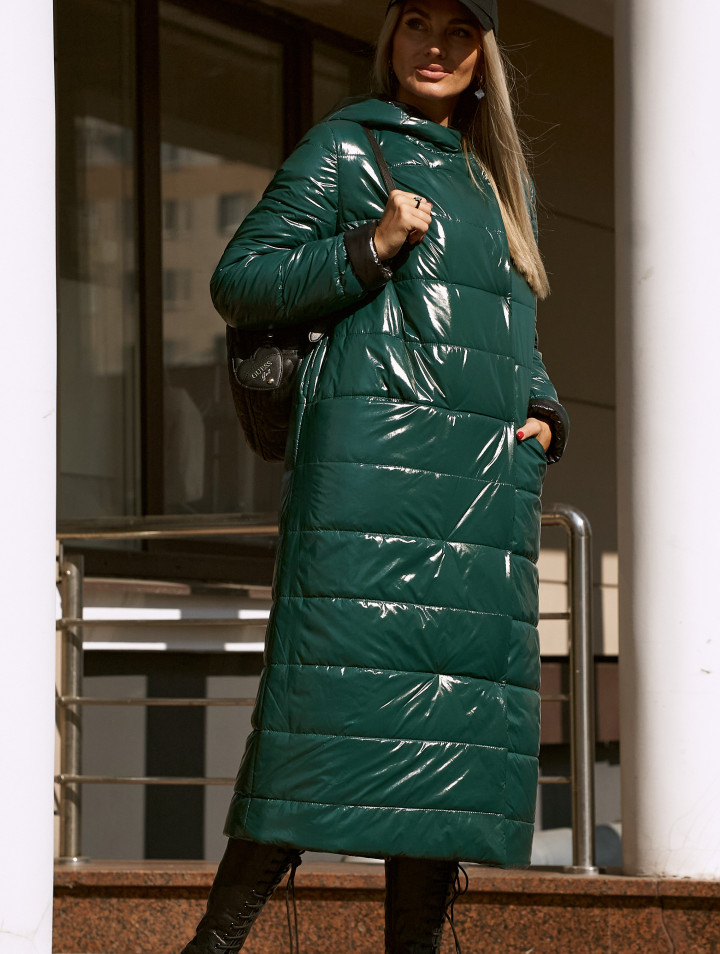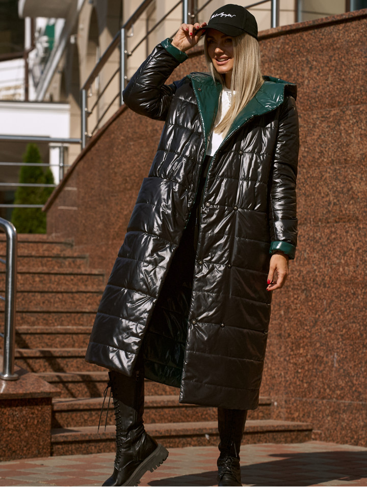 Пальто женское зимнее, удлиненное, двухстороннее, двухцветное, из плащевой ткани с лаковым покрытием, на утеплителе нового поколения ISOSOFT (пальто 300г/кв.м., рукав 200г/кв.м.). Прямого силуэта, двубортное, застегивается спереди на кнопки. Рукав втачной двухшовный с цельнокроенной манжетой по низу, по переду в горизонтальных швах-карманы, изделие с капюшоном. Рекомендуется носить при температуре -10 и до -20 градусов.